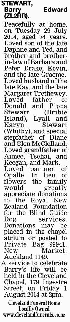 Barry ZL2RRLoved son of the late Daphne and Ted, and brother and brother in law of Barbara and Peter Drake, Kevin, and the late Graeme.